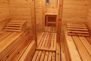 Это квадратное изделие с закругленными углами. За счет такой конструкции во время топки воздух циркулирует по кругу, поэтому баня-бочка нагревается не более 30 минут. Баня включает в себя раздевалку и парилку. Лавочки из кедра установлены по всей длине бани-бочки с обеих сторон. Печь расположена в парилке около дальней стены. Для удобства пользования в раздевалке находится вешалка и полочка из кедра. По вашему желанию баню-бочку квадро можно укомплектовать козырьком, верандой и печью с внешней загрузкой, благодаря которой весь мусор после топки остается на улице. Баня-бочка квадро не требует полноценный фундамент, поэтому при необходимости ее можно перенести в другое место.