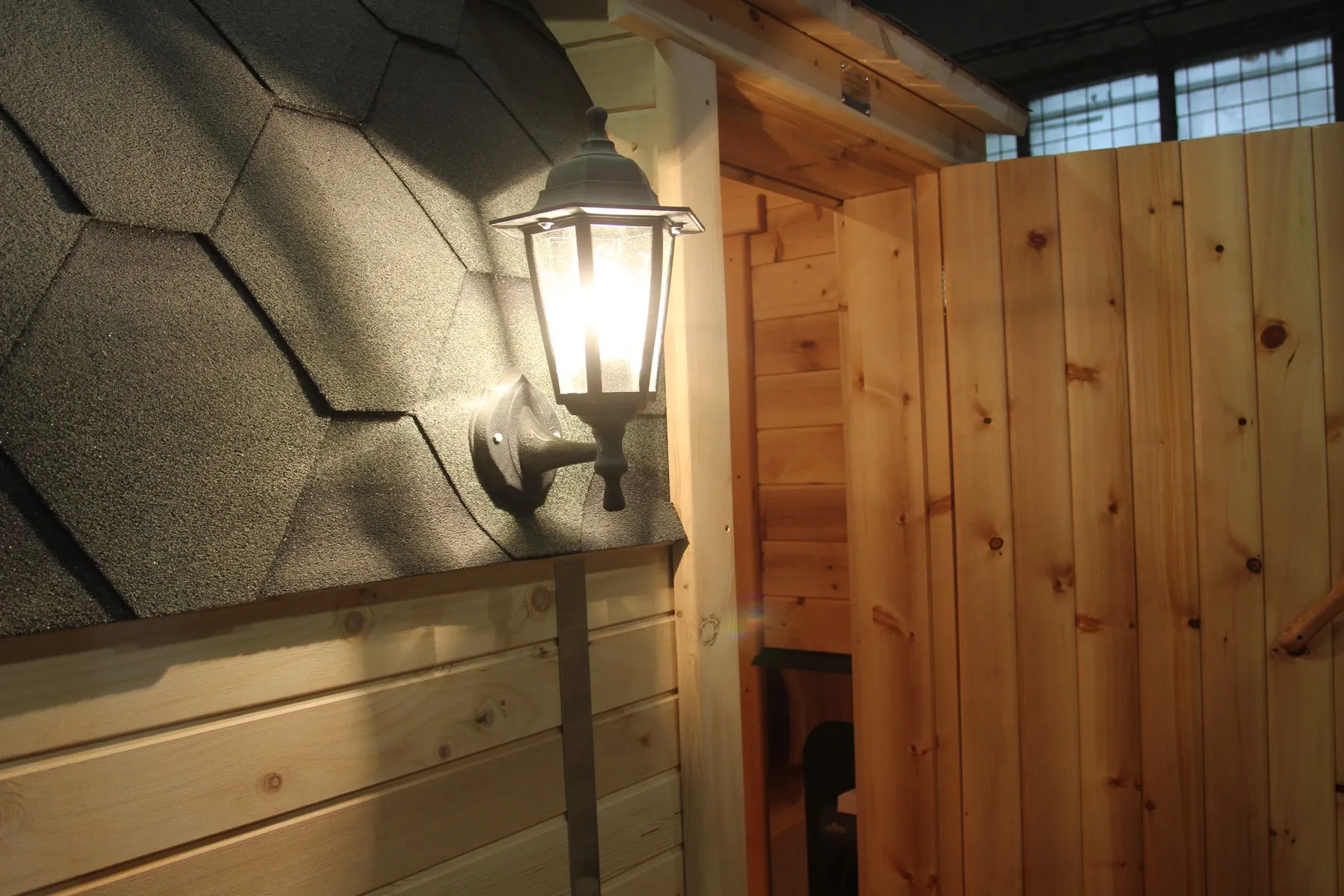 Изысканный светильник под старину сделает вашу баню особенной, добавив красоты и света снаружи.