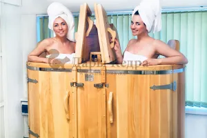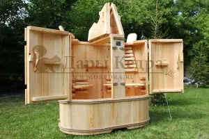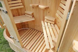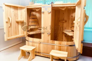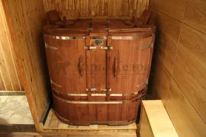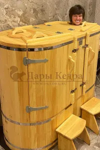 Двухместная фитобочка из кедра - это парная, в которой удобно принимать процедуры двум людям. Она оборудована откидными створками, дверцей, отверстием для головы и перегородкой (по желанию). Толщина стенок составляет 25 мм. Во время парения человек находится внутри кедровой бочки, а голова снаружи. Благодаря этому исключается возможность перегрева. Подлокотники из кедра и внутренние ручки делают эксплуатацию фитобочки более удобной.