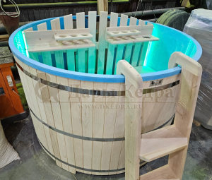 Это уличная подогреваемая купель с круглой внутренней чашей из термопластика. Для удобства пользования купель оборудована лавочками, приставной и внутренней лестницей. Нагрев воды происходит за счет встроенной печи, которая находится внутри купели за перегородкой. В комплектацию этой модели входит савок с длинной ручкой, который позволяет извлекать угли после эксплуатации изделия. Термопластик устойчив к воздействию температур, облегчает уход за купелью и увеличивает срок ее службы.