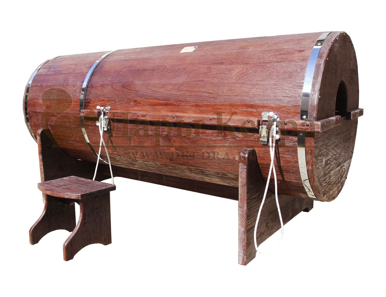 Кедровая бочка (фитобочка) полулежачая «Профессиональная» Кедровая фитобочка полулежачая - это мини парная, которую можно использовать не только в спа-салонах, но и дома. Модель этой бочки наиболее комфортна, так как позволяет принимать процедуры полулежа. Толщина стенок составляет 40-45 мм, что позволяет увеличить срок службы изделия. Фитобочка оборудована откидными створками, дверцей и отверстием для головы. Во время парения человек находится внутри кедровой бочки, а голова снаружи. Благодаря этому исключается возможность перегрева. Подлокотники, подспинник из кедра и внутренние ручки делают эксплуатацию фитобочки более удобной. Парение в фитобочке благотворно влияет на организм в целом: повышается иммунитет, выводятся шлаки и токсины, улучшается работа органов тела и состояние кожи.