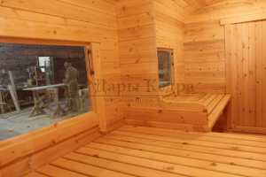 Веранда со скамейками даст возможность посидеть на свежем воздухе в перерыве между банными процедурами.